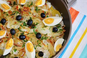 Comenzamos a montar el plato. En la cazuela ponemos una primera base de patata laminada. Sobre la patata colocamos el bacalao desmigado y la leche de marinar y sobre éste la cebolla del sofrito. Llevamos al horno precalentado a 180º durante unos 10 minutitos. A la hora de llevar a la mesa añadimos unas aceitunas negras, los huevos duros cortados en cuartos y espolvoreamos perejil fresco picado.