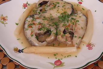 4 rodajas de bacalao noruego de 200 gr cada unaun diente de ajo picado1/2 cebolla picada2 cucharadas soperas de harinauna cucharada de perejil fresco picadosalun litro de caldo de pescadoaceite de oliva8 espárragos blancos troceados