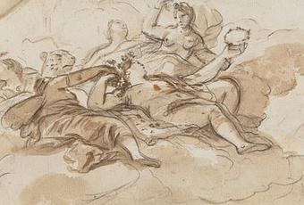 Dibujo preparatorio para el grupo de Baco rodeado de ninfas, en el fresco de la Alegoría del Toisón de Oro, en el Casón del Buen Retiro, pintado por Giordano en los últimos años del siglo XVII, en torno a 1697. Se conservan otros dibujos para este fresco en el Metropolitan Museum (Nueva York), en la Biblioteca Nacional de España (Madrid) y en el Museo de El Prado. La actividad de Luca Giordano como dibujante es notable y destacan, sobre todo, los dibujos de su etapa de madurez, en los que con una técnica muy simple de trazos de lápiz negro con aguadas transparentes, sabe captar los elementos fundamentales de una composición.