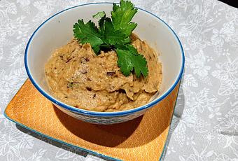 El baingan bharta significa puré de berenjena, es un plato de origen indio cuya base es la berenjena asada, lleva tomate, cebolla, especias y hierbas aromáticas...