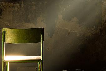Foto: 'A lone green chair in a dark dirty room, a ray of sunlight+shines+through+the+window+on+the+green+chair'