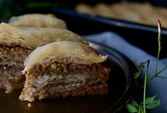 - Horneamos la baklava durante 1 hora 15 minutos. Cuando esté dorada, sacamos y terminamos de cortar.