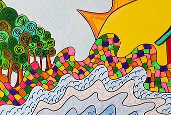Con un camino de baldosas de colores, unos arboles de hojas en espirales, un lago en movimiento y un super y gigante sol.