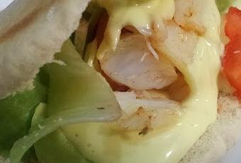 Calentar el pan de pita y abrir por la mitad e introducir con la ayuda de una cuchara los jugos que ha soltado el pescado en la plancha sarten, añadimos después las hortalizas y salseamos al gusto la salsa de yogur con hierbas provenzal.