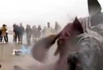 Estas imágenes de la explosión de las entrañas de una ballena muerta han aparecido cuando los trabajadores cortaban pacientemente su cadáver para sacarlo de la playa.