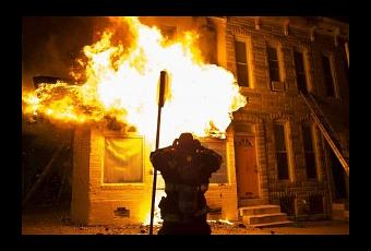 Bomberos acuden a extinguir las llamas en un edificio durante los disturbios provocados durante una protesta contra la muerte de Freddie Gray en Baltimore (Estados Unidos). (John Taggart / EFE)