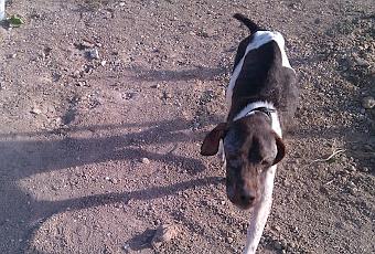 ES UN BRACO, de caza , abandonado por su lehismania, es super BUENO, y una vez ha bebido y comido un poco parecia que habia entrado en el reino de los cielos el angelito¡¡¡