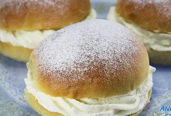 5- Precalentar el horno a 190º, y hornear unos 12-15 minutos. Dejar enfriar sobre rejilla, abrir por la mitad y rellenar con la nata. Espolvorear con azúcar glas.