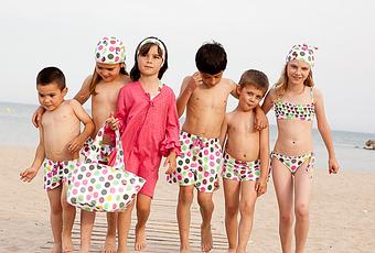 Me gusta que en cada colección los bañadores infantiles se combinan con alegres camisetas para los bebés y gorritos, diademas y bolsas de playa para las niñas.