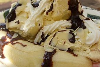 A continuación colocar sobre el plátano en el centro dos bolas de helado, por ejemplo una de chocolate y otra de vainilla, y en los extremos con ayuda de una manga pastelera dos porciones de nata, formando como una flor.