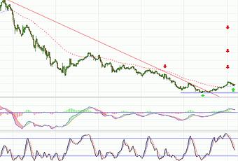Banco Espirito Santo: el gráfico en escala semanal nos dice que el título por fin logra rebasar la directriz que guiaba las fortísimas caídas desde los 6,50 hasta los terroríficos 0,50 €.