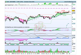 La semana pasada rompía nuevamente este techo, sin embargo en el intento de fuga que realizó a principios de año marcó un nuevo máximo en los 6,85€ que no ha sido hasta la presente semana cuando se ha superado. La situación técnica que presenta el valor es bastante buena. El precio cotiza por encima de la mm de 30 sesiones que mantiene su pendiente alcista, la divergencia bajista que dibujó entre octubre del año pasado y enero de este año se ha roto, el RSc Mansfield muestra la fortaleza que tiene el Banco de Santander y por último, el Atlas acaba de dar señal por lo que es probable que se dé un movimiento violento. La cotización cada vez se encuentra más próxima a los máximos históricos marcados a finales del 2007, antes de la crisis que asoló a la mayoría de los valores del Ibex 35.