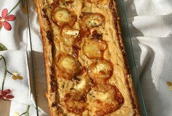 Ponemos esta mezcla en la base de hojaldre, sobre ella las lonchas de jamón y encima el queso de cabra cortado en rodajas.