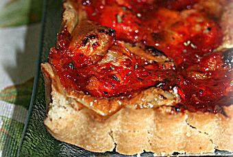 A continuación cubrimos cada rodaja de queso con un poquito de la mermelada de pimiento asado.