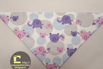 Tenía yo ganas de hacer una bandana, (del idioma hindi: bandhana "atar, atadura) o pañuelo (para la cabeza) es una pieza triangular o cuadrada de tela atada alrededor de la cabeza o alrededor del cuello con fines decorativos o protectores (fuente Wikipedia).Había visto muchas por la Red, pero pocas medidas, así que al final improvisé, y como no tengo ningún bebé al que probar no tengo idea para que edad me ha salido, ya os contaré....La tela de elefantitos me gustaba (estoy en momento "elefante"), y para el interior me decanté por una tela de rayitas en color salmón.