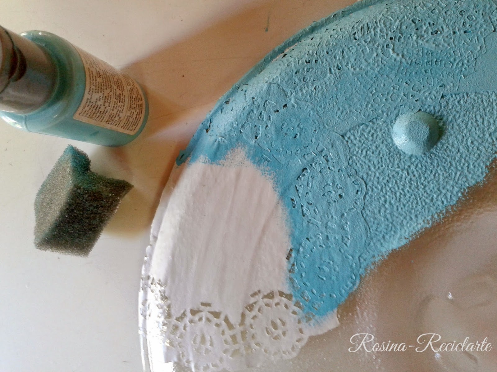 Desplegué doscientos mil posibles materiales sobre la mesa y me decidí por blondas que me sobraron de la mesa navideña y pintura celeste y beige.