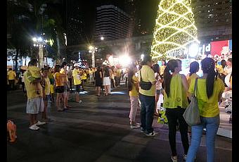 Estoy en Bangkok por tercera vez, esta vez coincidiendo con el cumpleaños del rey y el día del padre todo en uno. Más de la mitad de las personas que me rodean llevan una camisa, camiseta o van completamente vestidas de amarillo, en algunas se puede leer “Larga vida al rey” en inglés en otras supongo que dice lo mismo pero está en Tailandés. Si los días normales las calles y edificios están llenos de fotos del rey hoy parece que se han vuelto locos.