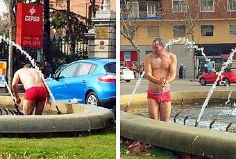 Pasear por la gran urbe es lo que tiene, que te encuentras la sorpresa agazapada en cualquier esquina... Hoy, y a mi paso por la Glorieta de Embajadores, esto fue lo que vi: un señor tomando un baño en el agua fría que cabe imaginar para el mes de febrero de un invierno tardío, dentro de una fuente pública.