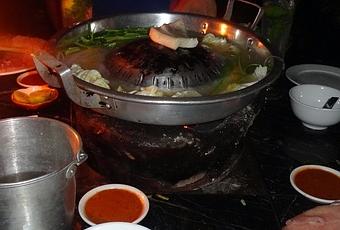 La mecánica de la barbacoa laosiana es prácticamente la misma que la coreana. Te sientas alrededor de una mesa que tiene un agujero en el centro que rellenan con ascuas de carbón ardiendo. Sobre las mismas ponen un trasto en forma de exprimidor de naranjas que hace las veces de parrilla. En la parrilla se cocina carne, vegetales y fideos. En algunos sitios se atreven también con algo de pescado, sobretodo calamares.