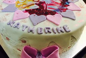 Para esta tarta hemos utilizado también buttercream de dulce de leche para el recubrimiento, y la cubierta de fondant lateral con dibujos ya marcados. En la parte superior se colocó la foto con bordado de corazones rosas y moraditos y un suave baño de purpurina rosa, alcanzando esta tarta una altura de 12cm.