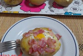 Ingredientes:4 patatas grades4 huevos200 gr de beicon en tiras50 gr de queso azulpimientasal