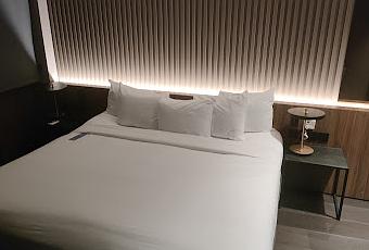 La pared del fondo está completamente ocupada por la ventana. De lado a lado. Y desde el techo hasta media altura. Protegida por dos estores superpuestos. Uno más metálico, pegado a la ventana, y otro de tela gris en el lado de la habitación. Impiden con eficacia que la luz pase. Desde la ventana, se ve aquí el jardín que rodea el hotel y los coches aparcados, y allá algo más lejos el resto de edificios corporativos que configuran el parque empresarial. En el lado derecho encontramos la cama. Aunque el calibre del colchón es normal, destaca el blanco inmaculado y su enorme tamaño. Vestida con cinco almohadas muy cómodas se viste con un limpio y suave edredón que no está totalmente estirado en el interior, generando algunas incómodas arrugas. Aparece empotrada contra un cabecero de madera retranqueado en cuyo interior hay una tira de led que genera una agradable luminosidad en la habitación. Por encima otro tramo de cabecero de madera en vertical rematado a ambos lados por sendos espejos algo dorados. A cada lado hay sendas mesillas metálicas con la parte superior en madera. En ellas dos lámparas de noche que se encienden con un interruptor en forma de rueda y que ofrecen, igualmente, una atractiva luz. A ambos lados hay enchufes normales y enchufes USB, interruptores en negro para apagar las luces de la habitación. En una de ellas hay un teléfono, un bloc de notas y un bolígrafo.En la pared restante encontramos, tres focos reflectores que iluminan la zona, y una ventana protegida por una persiana de lamas de aluminio negro que da al baño. El descanso no es muy agradable, porque aunque la insonorización exterior es correcta -la zona por la noche es absolutamente tranquila- la interior deja mucho que desear y se escuchan las voces en el pasillo, las puertas, los ruidos en las habitaciones contiguas...