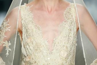 Tejidos europeos como encajes de chantilly, y guipures de seda, conjuntados con nuevos tejidos contemporáneos que permiten transportar a la alta costura para novia a épocas más modernas.