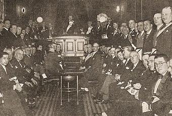 El lunch en la sala del Ateneo. El sexto de izquierda a derecha es el IL.·. y Pod.·. H.·. Augusto Barcia Trelles y a su lado (derecha) el Muy Resp.·. Gran Maestre Virgilio A. Lasca. A la izquierda de Barcia, otro español y Gran Maestre de la Obediencia, Miguel Servera.** *