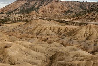 Vamos a intentar explicar, tal y como lo entendimos a través de unos carteles que había en la zona, sus orígenes. Esperamos hacerlo de una forma fiel y entendible. Por lo visto, se remontan a la formación de los Pirineos y la Cordillera Central a través del movimiento de las placas tectónicas, que se produjo de forma simultánea. La fuerza y presión de estas elevaciones del terreno llevaron a que se hundiera la zona de la depresión del Ebro, formándose una especie de mar. Los materiales más blandos, finos y erosionados llegaron a esta zona y quedaron durante kilómetros de sedimentos. Cuando el agua encontró su salida hasta su desembocadura, formando el Ebro, esta zona quedó con una apariencia totalmente desértica, llena de diferentes materiales y conformando un paraje singular. Encontramos arcillas, yesos, areniscas. Desde que ocurrió todo esto hace millones de años, la formación del terreno de la zona está en constante cambio.