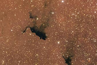 A algunos les puede parecer un pato, pero pone estrellas en lugar de huevos. En el centro de la imagen y arriba se encuentra Barnard 163, una nebulosa de gas molecular y de polvo tan espeso que la luz visible no puede brillar a través de ella. El interior de Barnard 163 es sin duda más frío que el exterior, lo que permite unas condiciones donde el gas puede agruparse y finalmente formar estrellas. Barnard 163 se encuentra a unos 3.000 años luz de la Tierra en la constelación de Cefeo Rey. El resplandor rojo de fondo corresponde a IC 1396, una gran nebulosa de emisión que alberga la nebulosa del tronco del elefante.