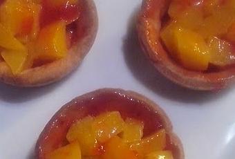 Podéis escoger la mermelada que queráis. Yo tenia abierto un bote de mermelada de fresas con mango. Pincelamos nuestra base con la mermelada y le ponemos por encima los trocitos de melocotón que previamente habíamos cortado. Volvemos a poner un poquitin de mermelada por encima y listos para comer!!!!