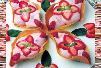 Manteniendo la bandeja sobre la boca del horno abierto, separar rápidamente los barquillos con una espátula de madera, de uno en uno. (Para que los barquillos adopten la forma adecuada, hay que trabajarlos en caliente. Utilizar varios moldes a la vez para hacer más rápida la operación.) Mientras aún están calientes, colocar cada barquillo sobre un pequeño molde invertido; perfilarlo para darle forma presionando ligeramente con la palma de la mano y pellizcándolo por los extremos. Dejar enfriar el barquillo durante unos instantes y separarlo delicadamente del molde. Preparar la mousse de fresas. En un cuenco, montar la nata; lavar rápidamente las fresas en agua helada, secarlas delicadamente con un paño y quitarles el peciolo.