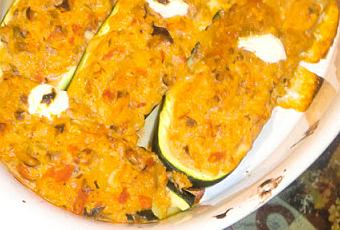 Lavamos los calabacines, los cortamos por la mitad y los vaciamos con cuidado de no romperlos. Yo he usado un sacabolas. Reservamos la carne del calabacín y colocamos las barquitas en una fuente de microondas y las ponemos a máxima potencia 6 minutos.