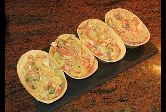 Ingredientes:- Un paquete de salmón o trucha ahumado.- Un puñado de zanahoria rallada.- 4 pepinillos grandes.- Un puñado de queso rallado.- 1 patata grande.- 1 huevo.- 1 lata de atún.- ¼ de lechuga.- Mayonesa.- 4 barquitas mexicanas.