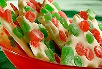 Extiende los chips fundidos sobre la bandeja previamente preparada. Da un par de golpes a la bandeja para igualar el espesor del chocolate blanco. Rocía con las pastillas de goma por la superficie. Refrigera durante 30 minutos o hasta que esté firme. Rompe en pedazos. Conserva en un lugar fresco y seco.
