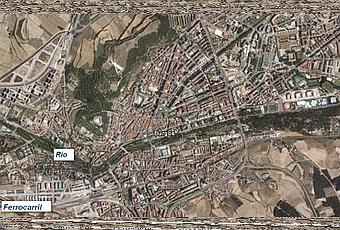 En la imagen, tomada desde la calle Madrid, se ve perfectamente esta barrera urbana y sus efectos sobre el desarrollo de la ciudad y todo lo que supone de incomunicación. Un auténtico muro de separación.