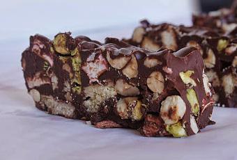 Barritas de chocolate crujiente con malvaviscos, avellanas y pistachos