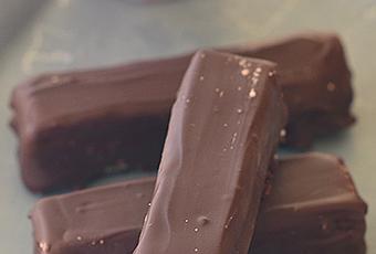 Lo sacamos de la nevera, y con la ayuda de un cuchillo grande y afilado, cortamos en rectángulos, que serán nuestras barritas.