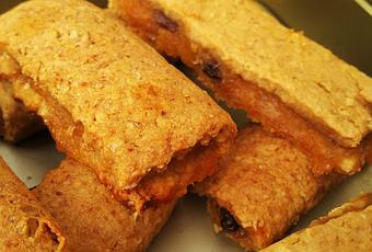 Barritas de manzana y canela1 1/2 tazas de harina de espelta o de trigo1/2 taza de copos de avena1 cda de margarina vegetal1/4 cdta de bicarbonato sódico2 cdas de sirope de agave o azúcar integraluna pizca de sal1 cdta de levadura en polvo4-5 manzanas2 cdas de pasas1/2 taza de azúcar integral1 cdta de canela en polvo1 cda de zumo de limón