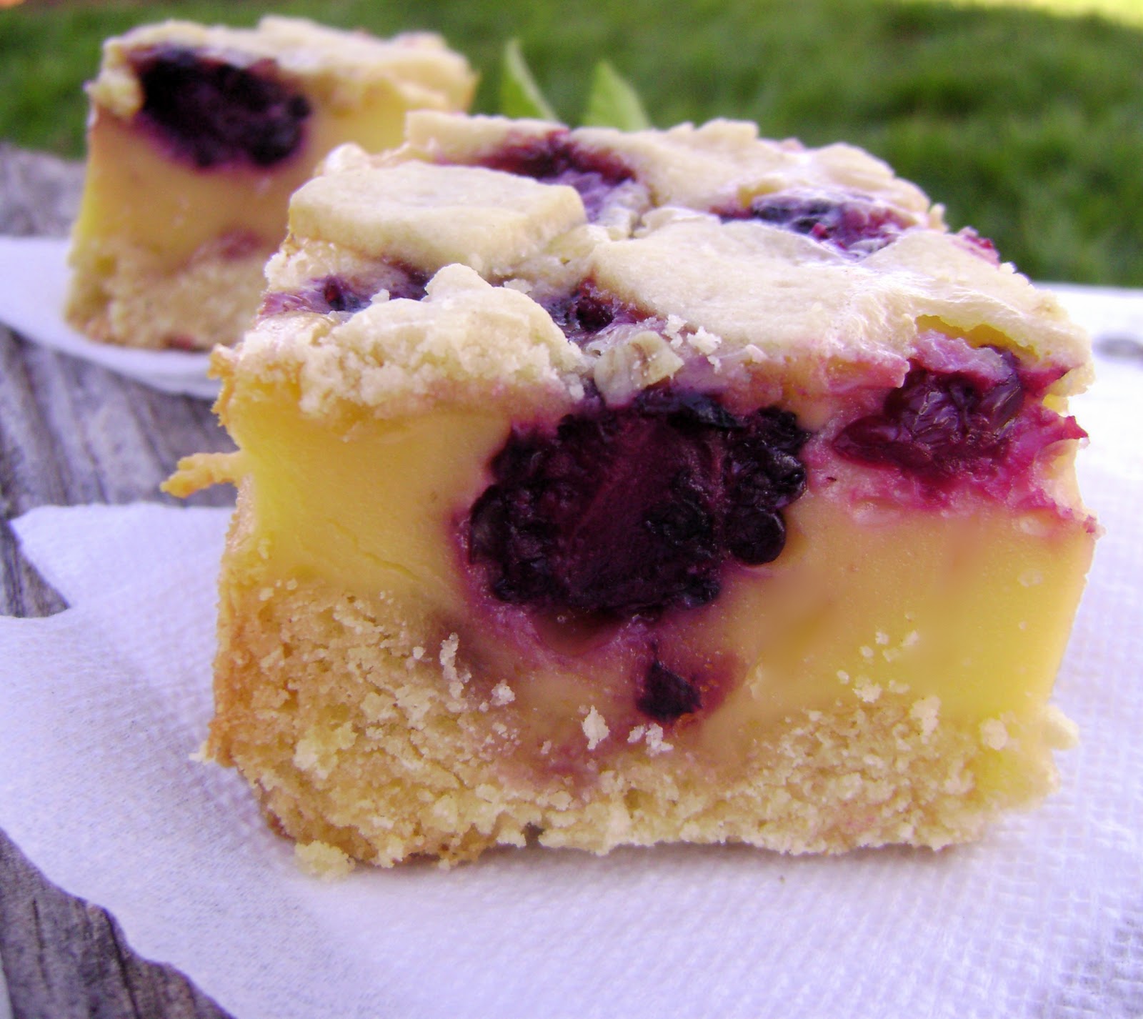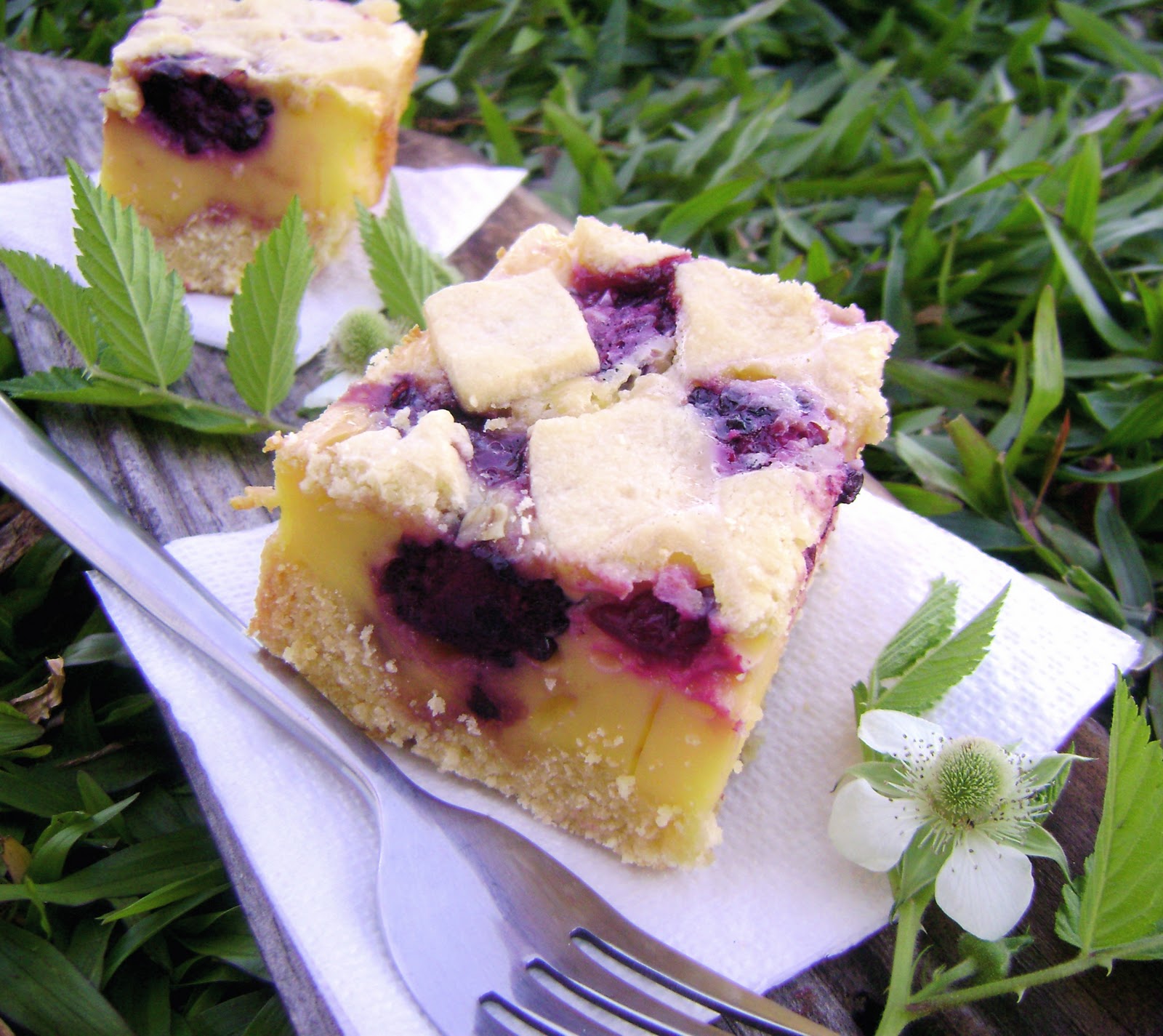 4. Mientras horneas la masa, bate en la batidora o licuadora, el huevo, leche condensada, nata y almidón de maíz. Cuando la masa quedar dorada, vierte esta mezcla líquida sobre la masa y por encima las moras cortadas al medio. Lleva para hornear nuevamente sobre un molde mayor con agua hirviente, para hacer un baño-María.