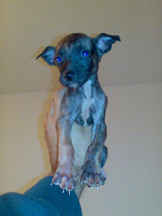 Este precioso cachorrillo es Bartolo. Cruce de galgo (es muy galgo), 4 meses, cariñoso y mimoso, es muy bueno y juguetón. Le abandonaron por feo porque todos sus hermanos eran blancos y a él no le quiso ningún galguero por su color (que, por cierto, es precioso). Es sevillano.