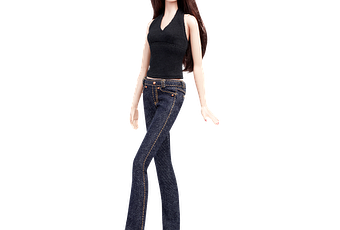 Esta muñeca Barbie Basics, lleva una moda vaquera y chaleco negro, con altos tacones de plataforma, que le dan un toque rockero. Su cabello lo lleva largo y castaño oscuro. El molde de su cara es el molde Loboutin. Pertenece a la nueva colección de Barbie Basics 002, diseñadas por Bill Greening.