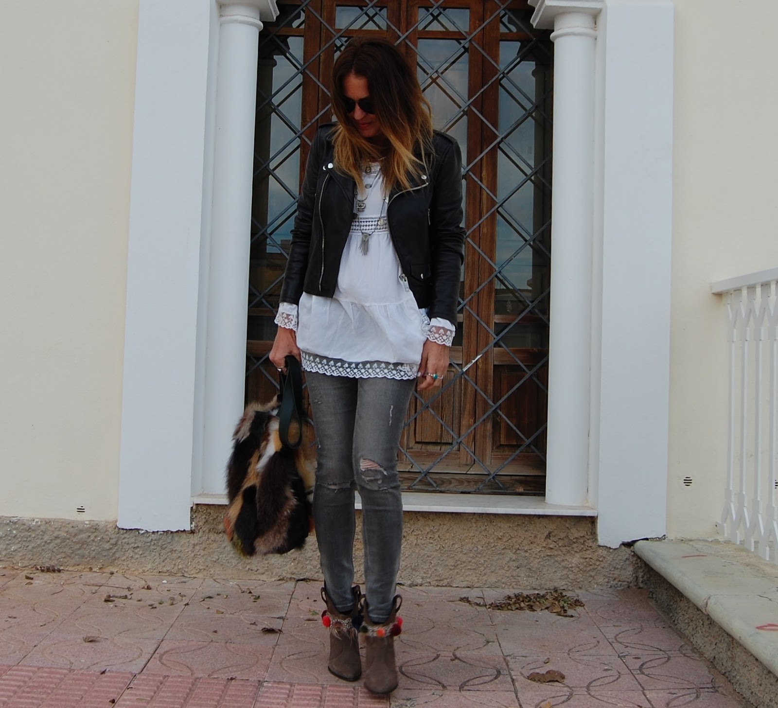 Como las dos piezas son muy llamativas, el look muy básico . Ripped jeans grises, cami romántica blanca y perfecto negra, sumando como siempre accesorios boho ( que ya os digo que no son solo para el verano. )