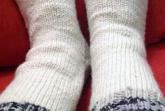 Unos calcetines gruesos para tener los pies calentitos en casa aprovechando restos de lanas. Con estos ya son tres las veces que he tejido este patrón . Fácil y rápido. La destinataria lleva un nº 39/40 , casi tres tallas más que yo, por eso se ven grandes en las fotos. Más detalles en Ravelry