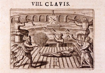 En un recinto amurallado, dos hombres sentados con ballestas apuntan a un blanco cuadrado con una diana circular, y una llave encima de ella. Siete flechas han dado en el blanco. Entre estos dos hombres hay cuatro pequeñas cruces y una tumba abierta en la que un cadáver resucitado está de pie con las manos levantadas. A la izquierda de la tumba, el maíz está brotando. En primer plano, un cadáver se encuentra en un campo arado. A la izquierda, un hombre siembra el grano. Detrás del hombre cuatro aves están comiéndose el grano. Debajo del cadáver hay una cruz. A la derecha se encuentra un ángel con alas sosteniendo un cetro en su mano izquierda, y soplando una trompeta.