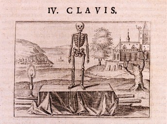 Un esqueleto se encuentra en una caja o féretro cubierto, a la izquierda una vela se quema, mientras que en la derecha hay un tocón de árbol. Detrás una iglesia.Quinta clave