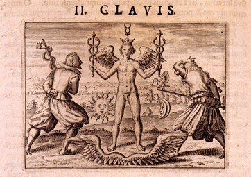 Mercurio está sosteniendo un caduceo en cada mano. A la izquierda el Sol y a la derecha la luna. Bajo sus pies un par de alas, a su izquierda, un hombre con una espada en la que una serpiente se enrosca, a su derecha un hombre con una espada, en la que un ave se posa.