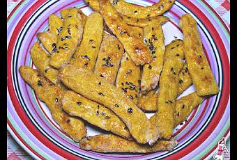 Estirar un poco la masa y cortar tiritas, (aprox 3 ó 4 cm de ancho y del largo que quieran), acomodarlos en una placa con rocío vegetal, no importa si los doblan un poco para que entren, porque son bien rústicos.
