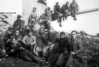 Bateria de Costa de Cabo Mayor donde realizo el servicio militar Camilo Jose Cela, esta en la foto sin gorra detras del soldado que esta tumbado en el suelo La copia es del libro Aires de Cueto.