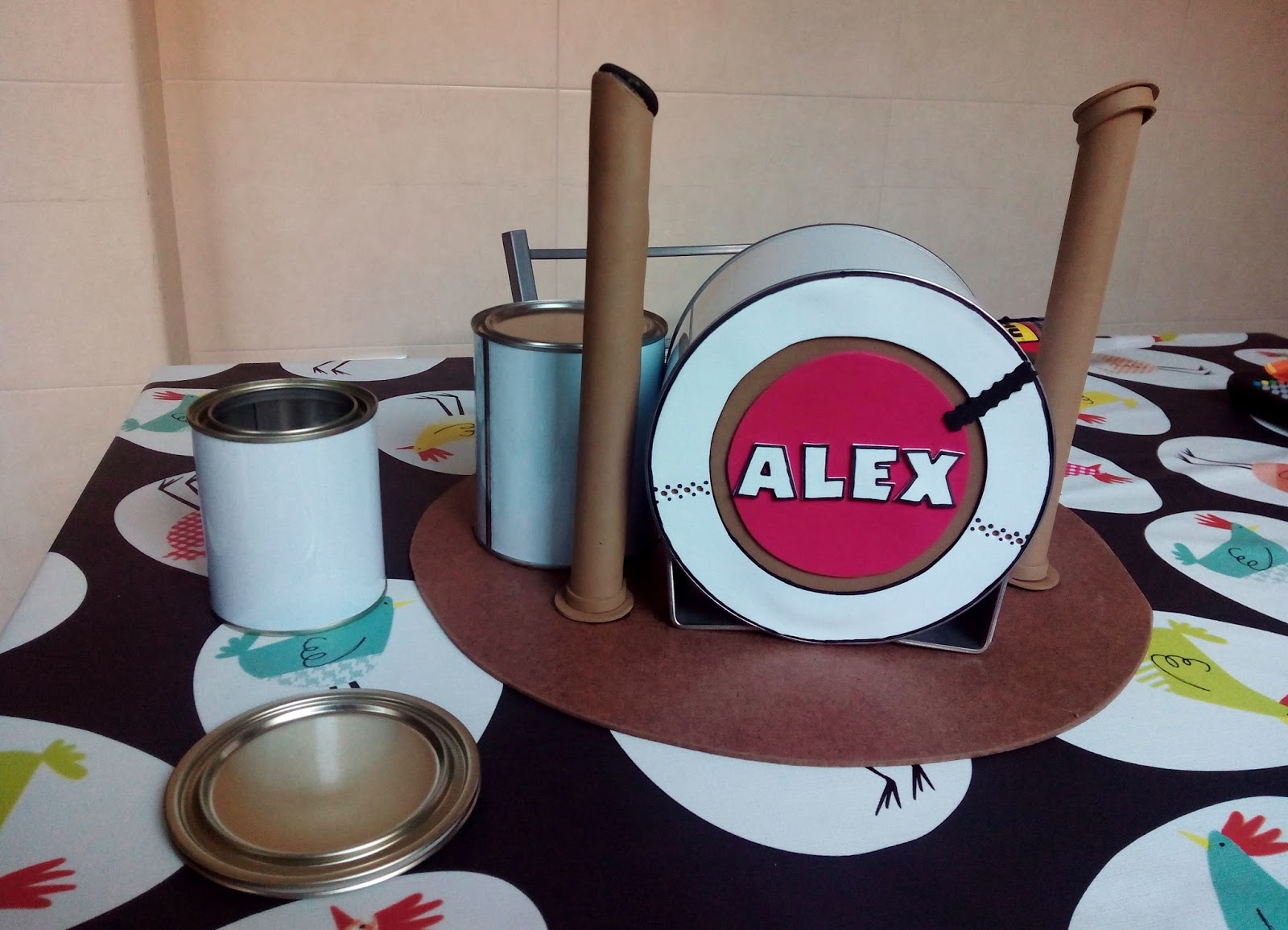 - Para la base: table utilizado para embalajes (cartón duro).- Botes metálicos de 3 diámetros diferentes (envases de ojalata para pintura).- Dos tapas de dichos envases.- Pletinas metálicas.- Tubo de agua.- Pegamento polímero trasparente.En casa disponíamos de:- Goma eva.- Pegamento.- Tijeras, cúter.- Lijadora,- Sierra.- Rotuladores....Para realizar la batería:1. Se cortó un círculo a medida para la base de la batería.Lijando el borde para evitar pequeñas imperfecciones.2. El tubo de agua se cortó en dos partes, la altura dependía del mayor bote que iba a ir haciendo de bombo.3. Con goma eva y rotulador se decoró el bombo de la batería.